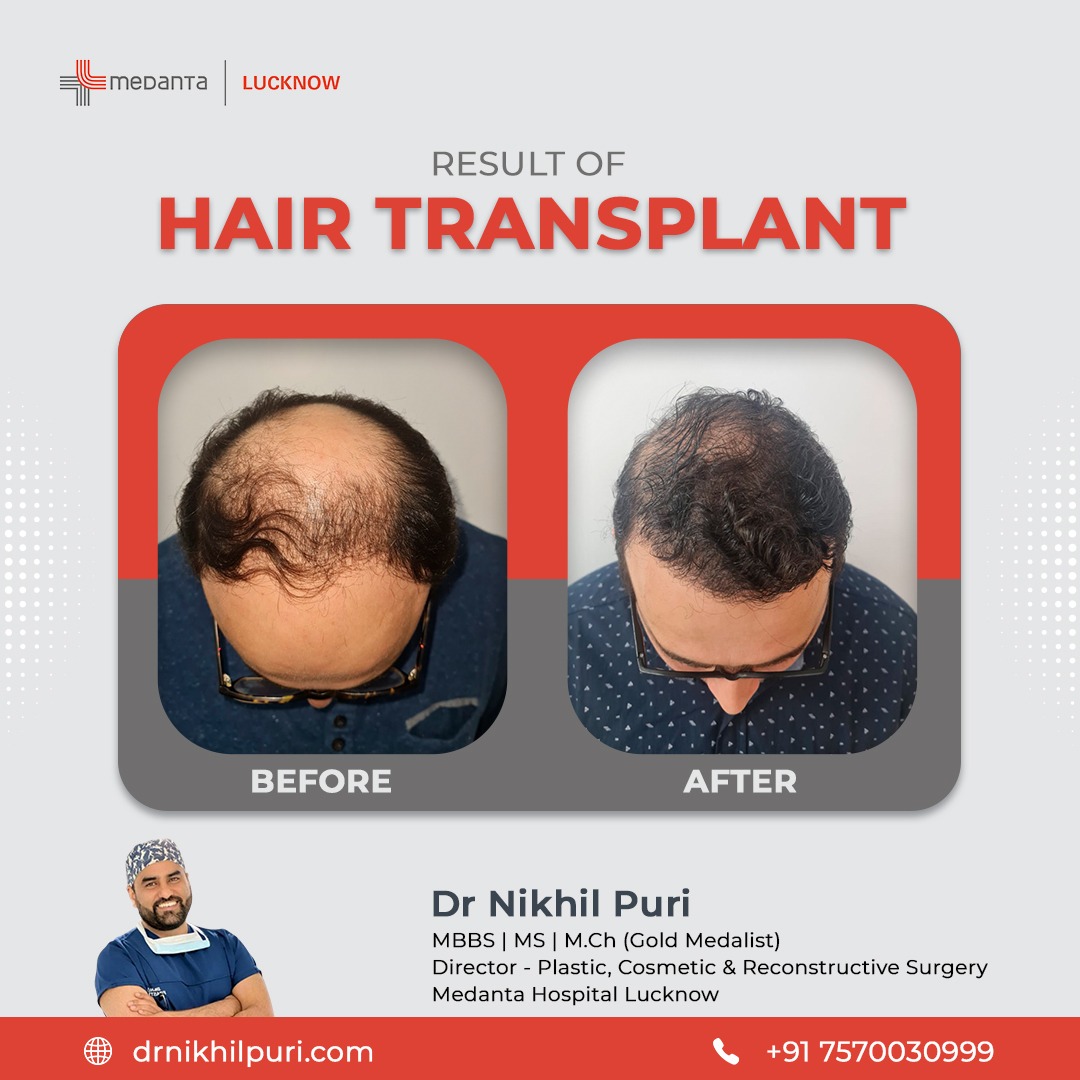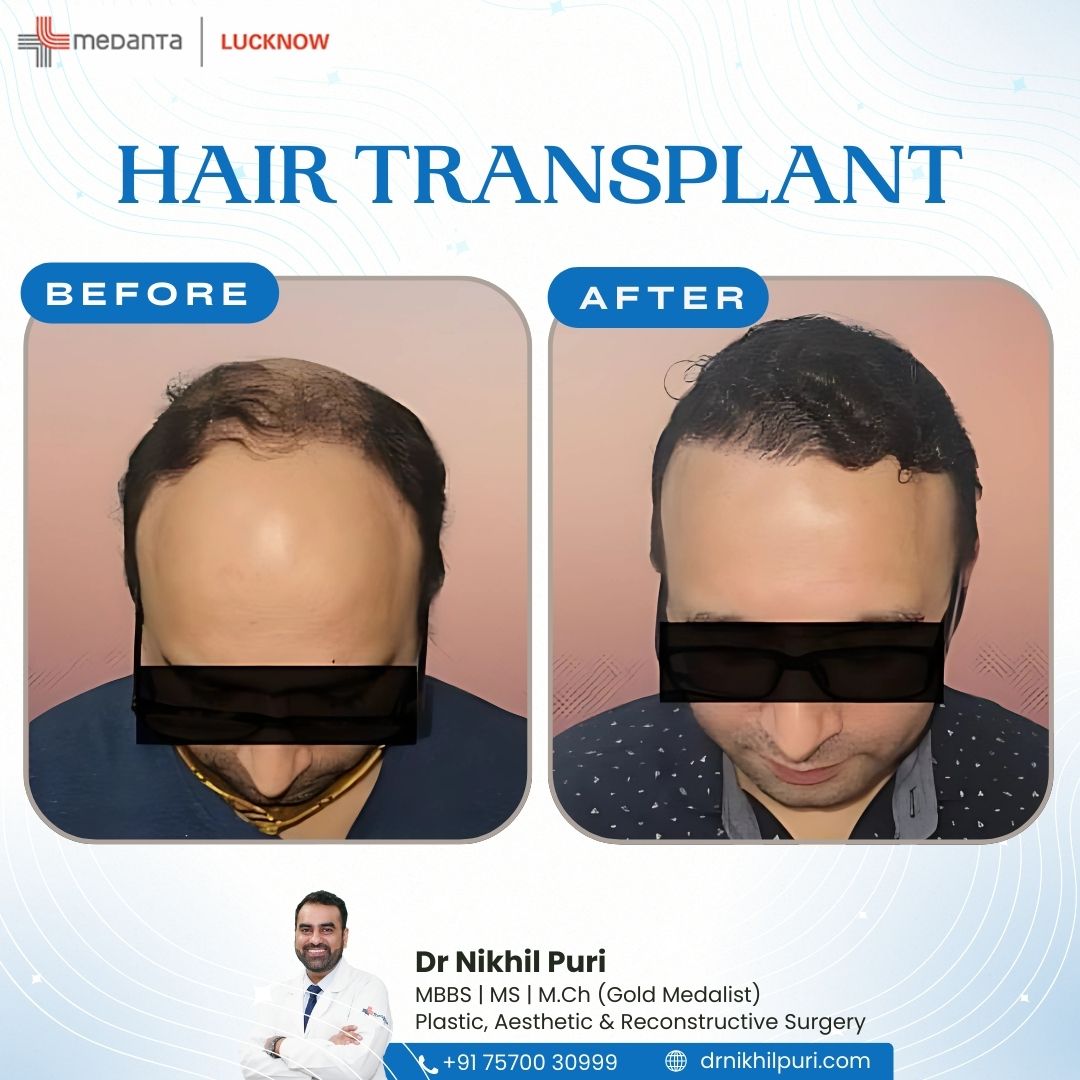 Before and after hair transplant results by Dr. Nikhil Puri in Lucknow showing increased density and natural hairline.